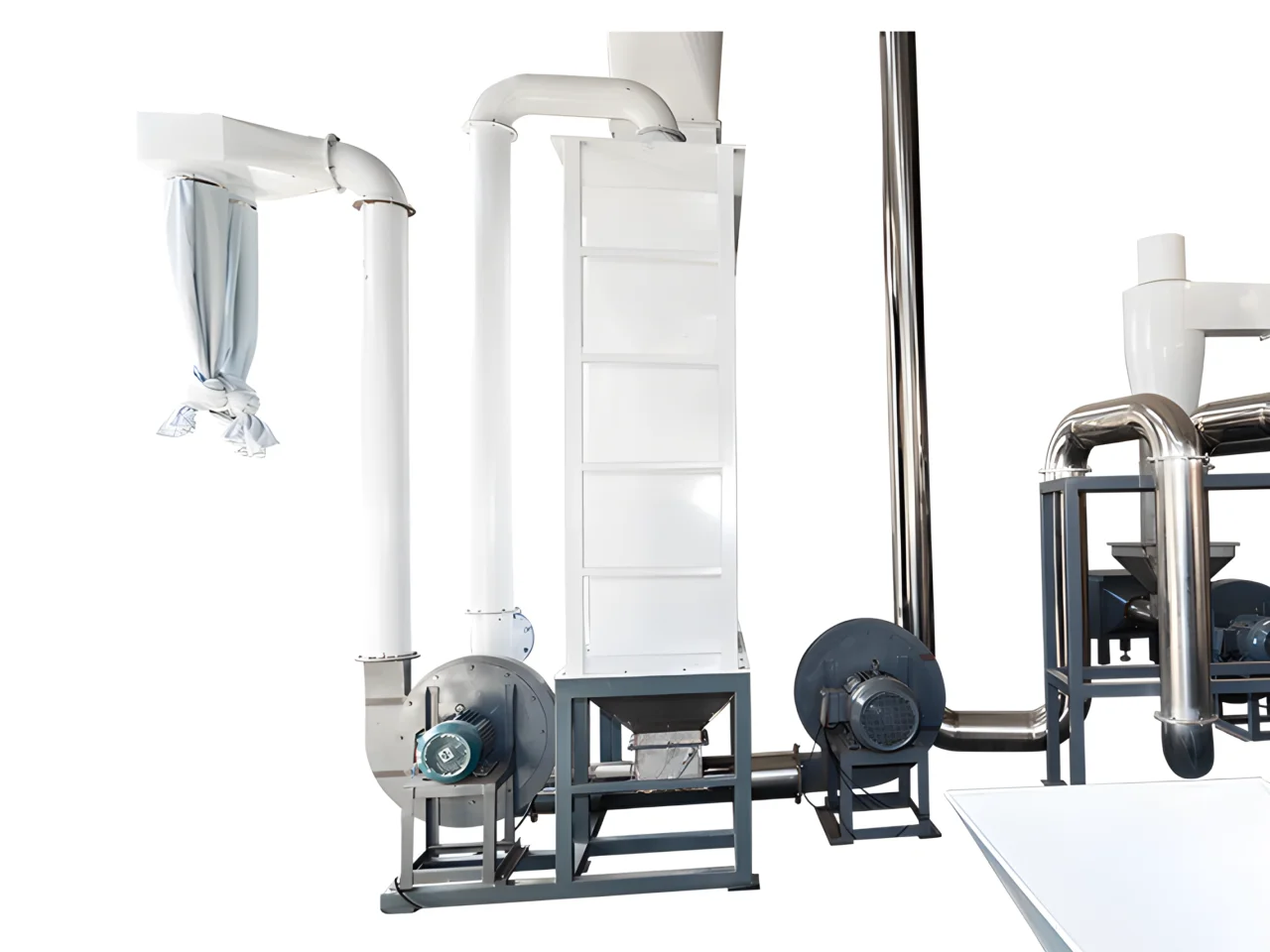 Opcjonalny etap końcowy do oddzielania lekkich zanieczyszczeń od cięższych granulatów plastikowych za pomocą strumienia powietrza.