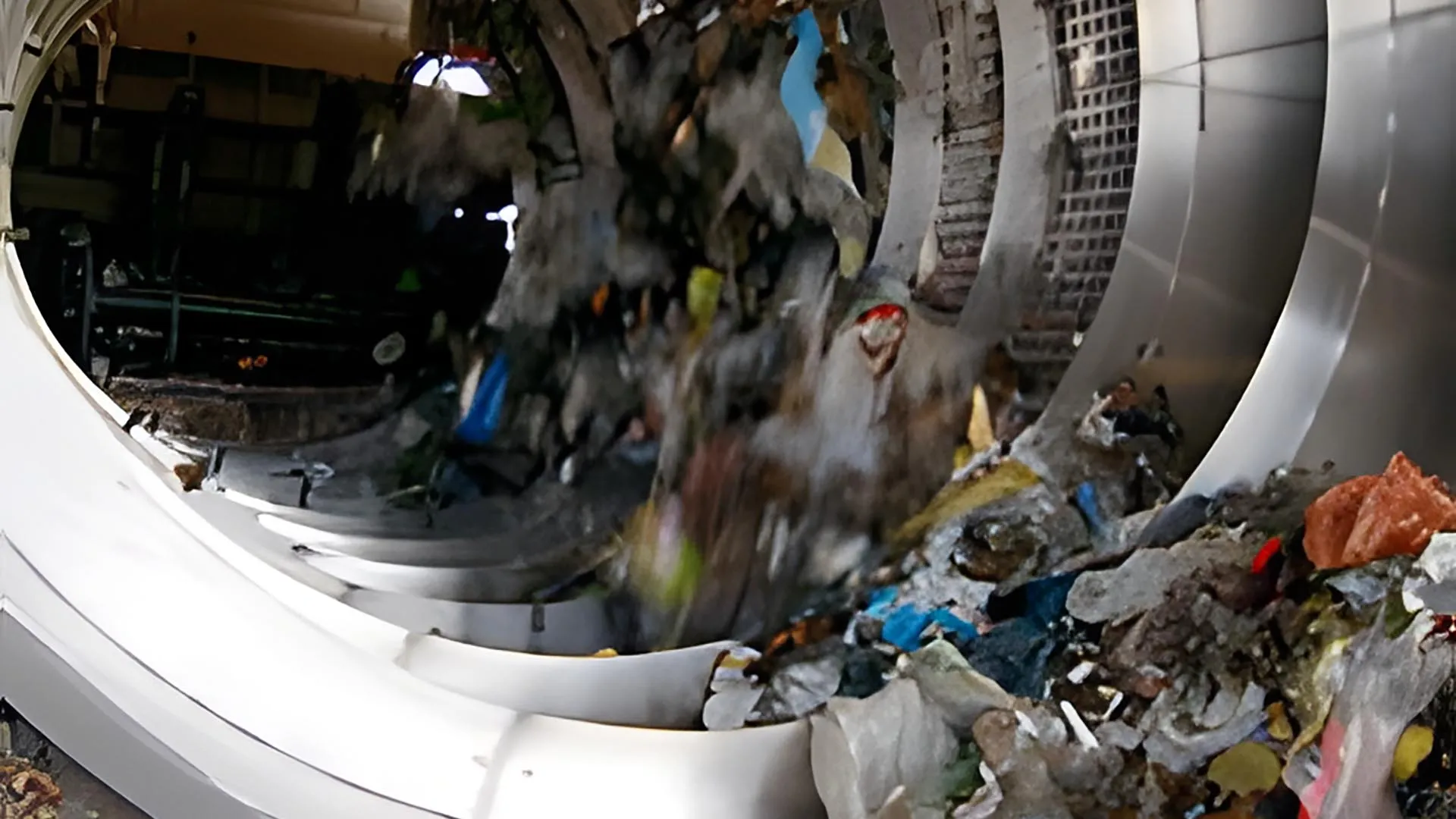 Mixed feedstock (e.g., MSW, C&D waste, co-mingled plastics) enters the angled cylindrical drum.