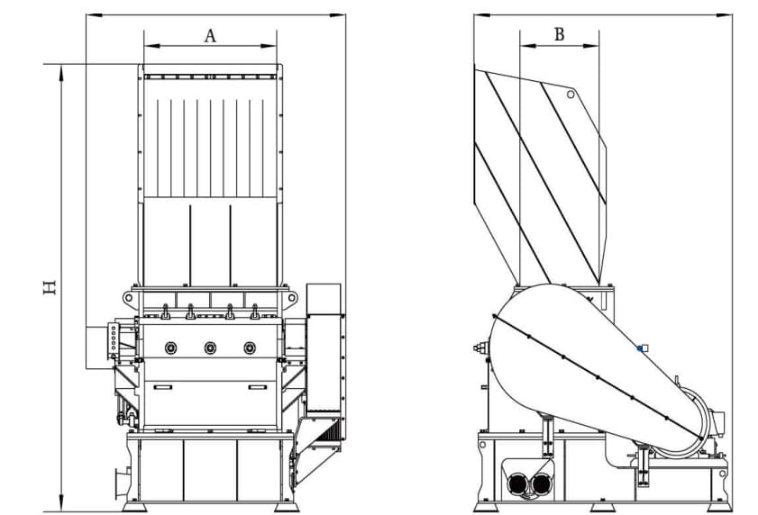 Our plastic Crusher machine operates with an open rotor that is mounted with heavy-duty knives in either a double-scissor cut or v-shape array based on your needs. As the rotor spins at high speeds, its knives come into contact with stationary knives mounted within the cutting chamber. The material is continuously cut until it is small enough to pass through a screen filter. Our filter screens typically range from 10mm to 100mm, but can be customized according to your requirements. Our standard plastic granulator contains 12 rotor knives and 3 stationary knives. All knives use ultra-durable D2 (equivalent to SDK11) high-carbon, high-chromium steel, ensuring the longest usage times before requiring sharpening. The knives are easily adjustable with hydraulic-assisted access to the cutting chamber.
